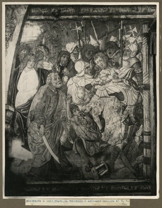 Riproduzione fotografica dell'affresco, ad opera di Gianfrancesco da Tolmezzo nel 1496, nell'abside della Chiesa di San Leonardo a Provesano di San Giorgio della Richinvelda. L'affresco fotografato raffigura "La cattura di Cristo" situato nella parete laterale destra.