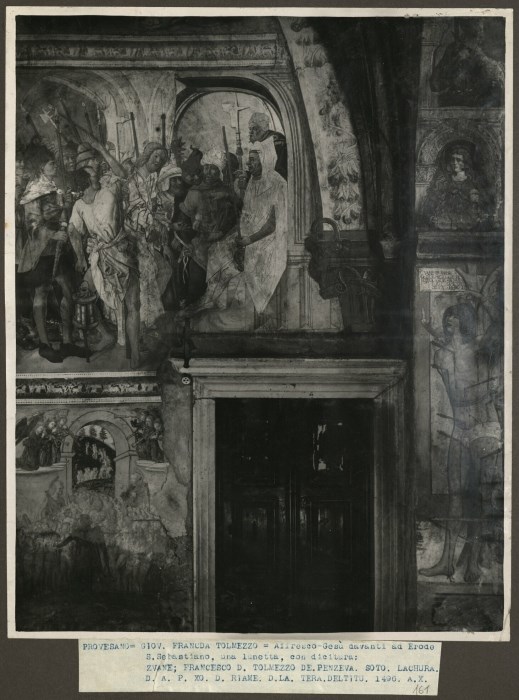 Riproduzione fotografica dell'affresco, ad opera di Gianfrancesco da Tolmezzo nel 1496, nell'abside della Chiesa di San Leonardo a Provesano di San Giorgio della Richinvelda. L'affresco fotografato raffigura "Cristo davanti a Caifa" situato nella parete laterale destra. A destra l'affresco con "San Sebastiano" ed un'iscrizione che attribuisce il ciclo di affreschi al già citato pittore.