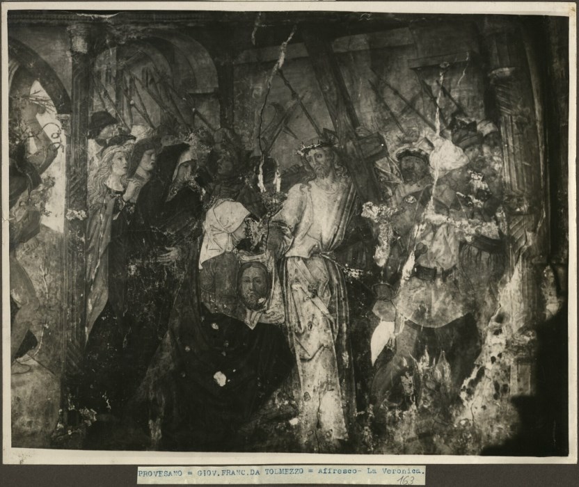 Riproduzione fotografica dell'affresco, ad opera di Gianfrancesco da Tolmezzo nel 1496, nell'abside della Chiesa di San Leonardo a Provesano di San Giorgio della Richinvelda. L'affresco fotografato raffigura "Salita al Calvario" situato nella parete laterale sinistra.