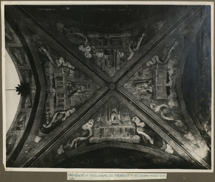 Riproduzione fotografica dell'affresco, ad opera di Gianfrancesco da Tolmezzo nel 1496, nell'abside della Chiesa di San Leonardo a Provesano di San Giorgio della Richinvelda. L'affresco fotografato raffigura "I quattro Dottori della Chiesa" sulla volta dell'abside.