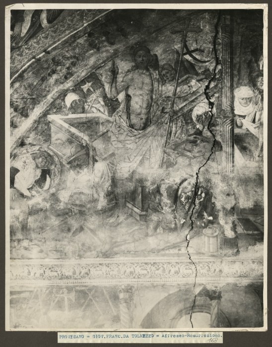 Riproduzione fotografica dell'affresco, ad opera di Gianfrancesco da Tolmezzo nel 1496, nell'abside della Chiesa di San Leonardo a Provesano di San Giorgio della Richinvelda. L'affresco fotografato raffigura "La Resurrezione" situato nella lunetta della parete sinistra.