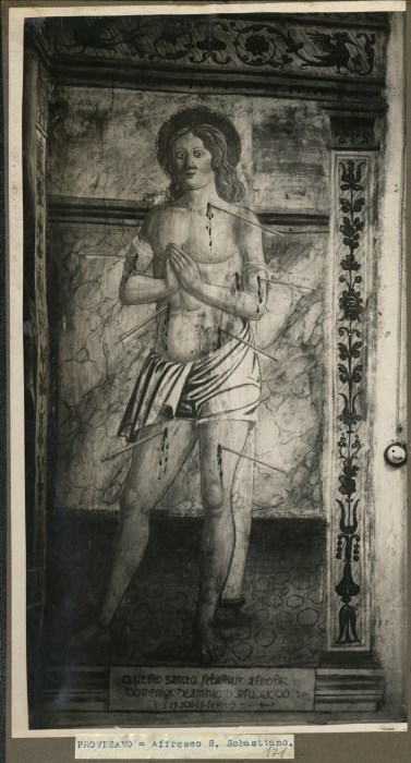 Riproduzione fotografica dell'affresco, ad opera di Pietro o Giampietro da San Vito nel 1513, nella Chiesa di San Leonardo a Provesano di San Giorgio della Richinvelda. L'affresco fotografato raffigura "San Sebastiano" ed è situato accanto all'arco trionfale.