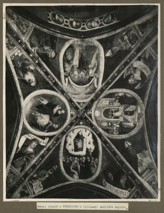 Riproduzione fotografica degli affreschi nel soffitto della cappella di San Lorenzo ad opera del Pordenone e, successivamente da Marcello Fogolino presso la Chiesa di San Lorenzo Martire a Rorai Grande di Pordenone. Nella volta sono raffigurati: Presentazione di Maria Vergine al tempio, la Fuga in Egitto, lo Sposalizio di Maria Vergine e la Madonna della cintola.