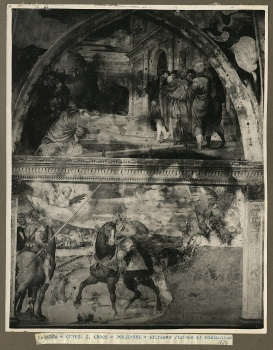 Riproduzione fotografica degli affreschi del coro della Chiesa di Santa Croce a Casarsa della Delizia, ad opera di Pomponio Amalteo nel 1536 e raffigurano le storie della Passione e della Croce: in basso la "Apparizione della Croce a Costantino", nella lunetta la "La Regina di Saba riconosce il legno della Croce".