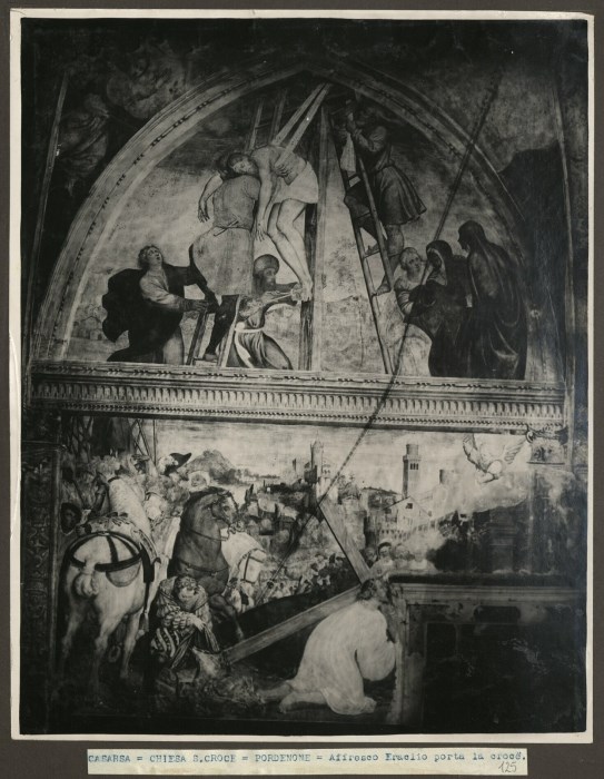 Riproduzione fotografica degli affreschi del coro della Chiesa di Santa Croce a Casarsa della Delizia, ad opera di Pomponio Amalteo nel 1536 e raffigurano le storie della Passione e della Croce: nell'immagine in basso l' "Imperatore Eraclio trasporta la sua croce in Gerusalemme", nella lunetta la "Deposizione".