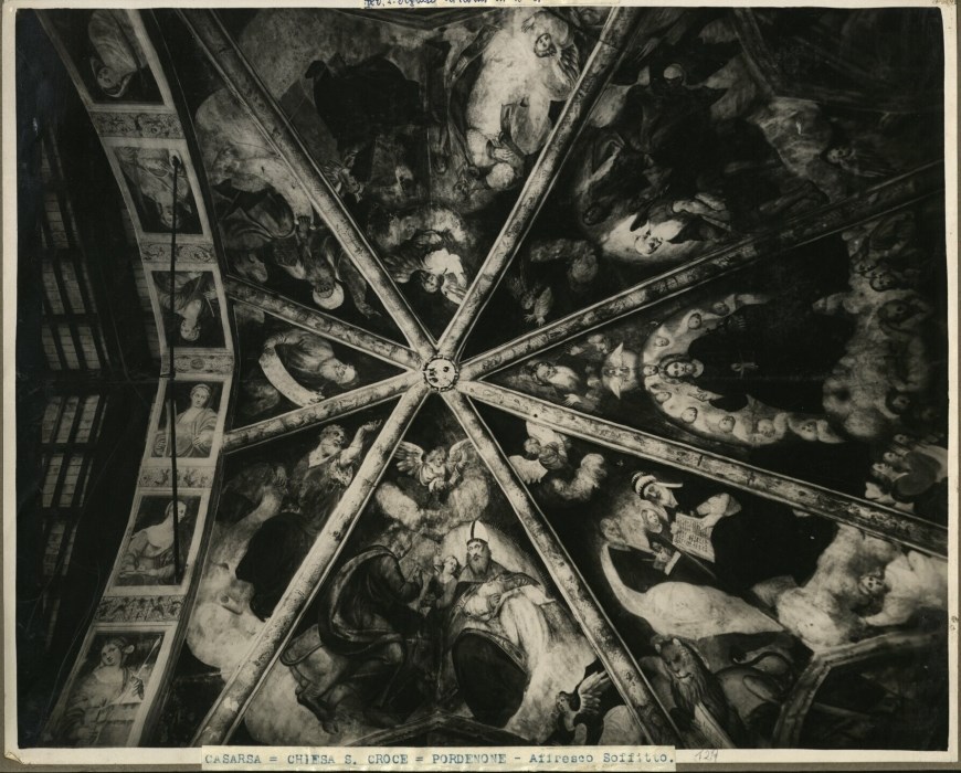 Riproduzione fotografica degli affreschi del soffitto del coro della Chiesa di Santa Croce a Casarsa della Delizia, ad opera di Pomponio Amalteo nel 1536 e raffigurano le storie della Passione e della Croce: nelle vele Cristo Redentore, Santi, Profeti ed Evangelisti. La volta è andata distrutta durante il Secondo Conflitto Mondiale, l'immagine è così testimonianza di com'era la volta affrescata dall'Amalteo.
