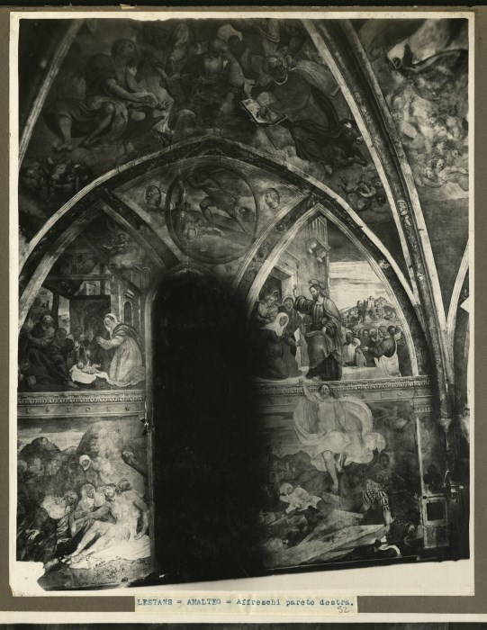 Riproduzione fotografica degli affreschi situati nella parete destra, con al centro una finestra, dell'abside nella Chiesa di Santa Maria Assunta a Lestans di Sequals e ad opera di Pomponio Amalteo nel 1546 circa.
