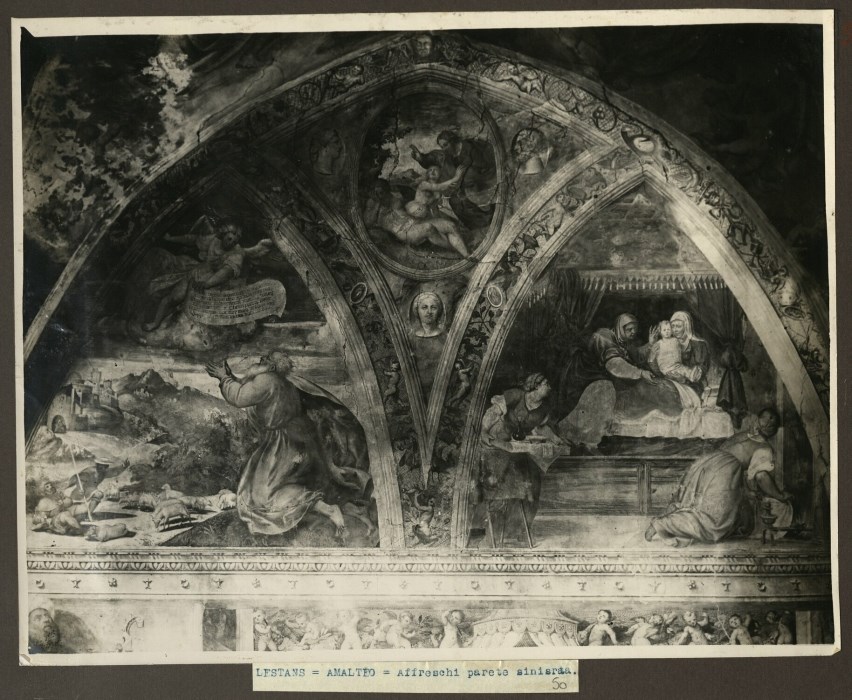 Riproduzione fotografica degli affreschi situati nella parete sinistra in alto al limite della volta dell'abside nella Chiesa di Santa Maria Assunta a Lestans di Sequals e ad opera di Pomponio Amalteo nel 1546 circa.