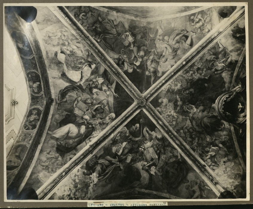 Riproduzione fotografica degli affreschi situati nelle vele dalla volta dell'abside nella Chiesa di Santa Maria Assunta a Lestans di Sequals e ad opera di Pomponio Amalteo nel 1546 circa. A destra è raffigurata "l'Incoronazione della Vergine e figure di Sibille", nelle altre vele "Profeti, Evangelisti e Dottori della Chiesa".