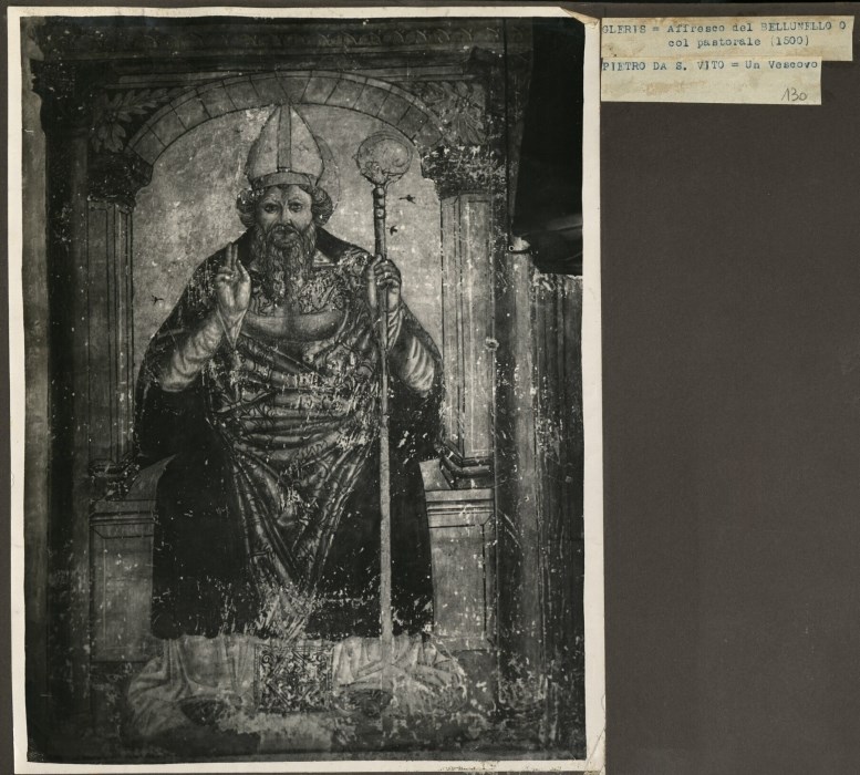 Riproduzione fotografica di un affresco, raffigurante un vescovo, ad opera del Bellunello attorno al XV secolo all'interno della Chiesa di Santo Stefano a Gleris di San Vito al Tagliamento.