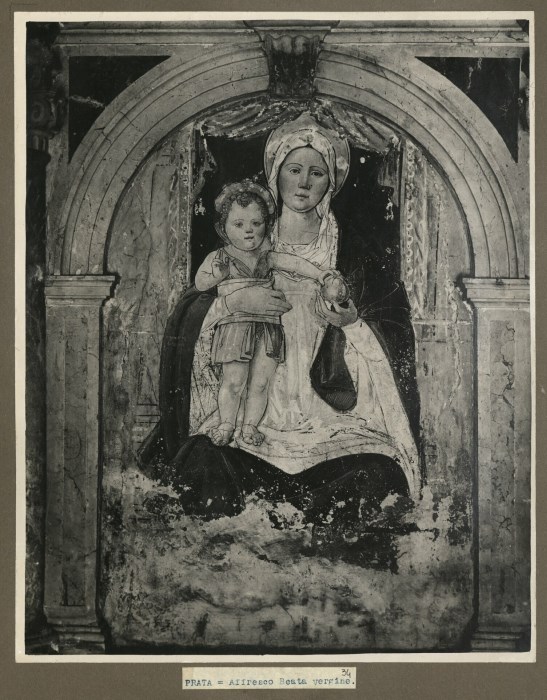 Riproduzione fotografica di un'affresco e raffigurante la "Madonna con Bambino", particolarmente degradata, conservata presso la Chiesa di Santa Lucia Vergine e Martire di Prata di Pordenone.