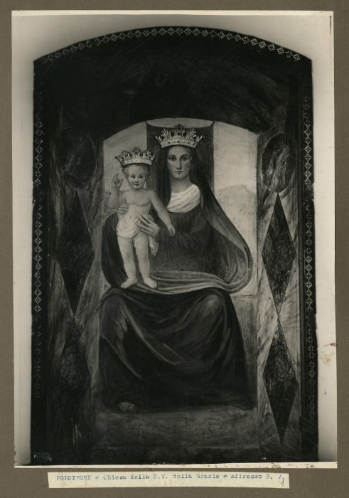 Riproduzione fotografica dell'affresco, posto in cornice, sull'altare maggiore della Chiesa della Beata Vergine delle Grazie a Pordenone e raffigurante la "Madonna con Bambino", di autore ignoto. In occasione della festività dell’8 settembre 1924 all’immagine fu imposta solennemente la corona donata dal cardinale Pietro La Fontaine, patriarca di Venezia.