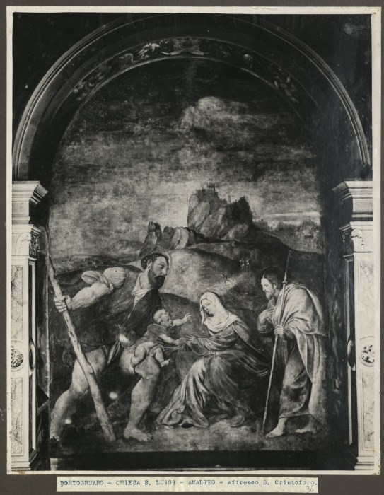 Riproduzione fotografica di un affresco raffigurante "San Cristoforo e Sacra Famiglia" a opera dell'Amalteo nel 1532 e conservato presso la Chiesa dei Santi Cristoforo e Luigi a Portogruaro.