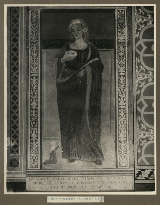 Riproduzione fotografica di un affresco risalente al 1514 raffigurante "Santa Lucia con una devota ai piedi" e visibile nella navata destra della Chiesa di San Giusto di Gruaro.