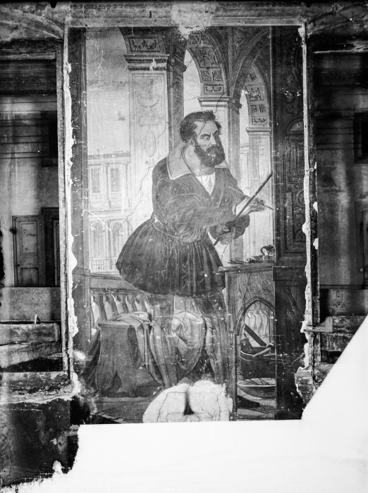 Affresco raffigurante un artista in abiti rinascimentali nell'atto di dipingere un quadro, alle sue spalle le arcate della loggia sulla quale si trova che si affaccia su un paesaggio urbano. Trattasi verosimilmente di affresco presente nel vecchio palazzo del Municipio di Udine, costruito su progetto del Sansovino ed ultimato nel 1578, demolito nel 1910 per la costruzione della nuova sede comunale di Palazzo D'Aronco. Lo scatto è verosimilmente stato fatto durante il cantiere di demolizione, insieme ad altre foto di documentazione dello stesso, presenti nella medesima raccolta.