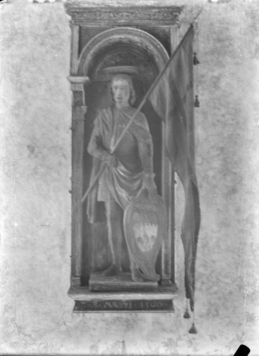 Riproduzione fotografica (immagine sfocata) di un affresco su di una parete raffigurante un Santo con una bandiera ed uno scudo all'interno di una nicchia.