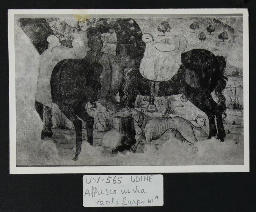 Udine, via Paolo Sarpi: affresco conservato all'interno di un palazzo storico ambientato in aperta campagna con una cane da caccia, tre cavalli e un fanciullo.
