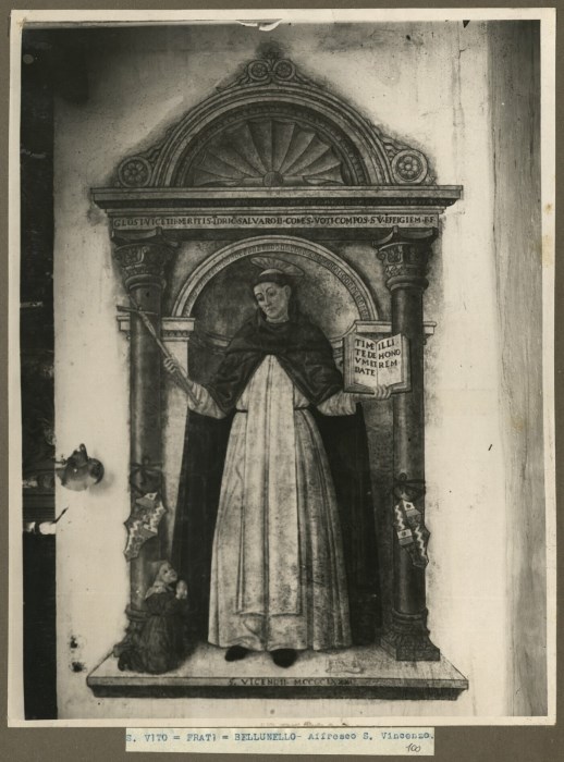 Riproduzione fotografica di un affresco del Bellunello nella Chiesa di San Lorenzo dei Domenicani a San Vito al Tagliamento. L'affresco raffigura San Vincenzo Ferrer, predicatore domenicano che visse tra il 1350 e il 1419, forse parte di una decorazione più ampia. Il Santo è raffigurato entro una finta nicchia, racchiusa da due colonne con elaborati capitelli, con architrave e timpano a forma di conchiglia. Ai suoi piedi vi è la figura del donatore rappresentato ancora in stile medievale, in ginocchio e con le mani giunte.Un cartiglio reca la firma del pittore “Opera de Andrea Belunelo de San Vido”.