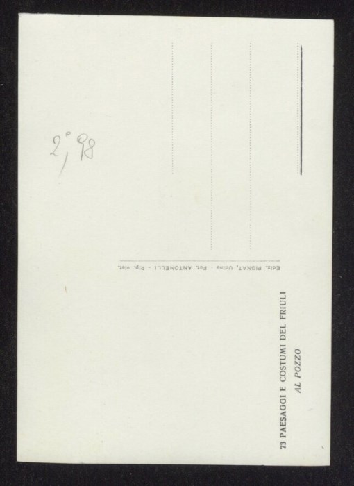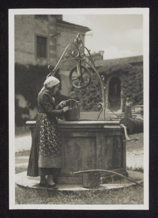 Lo scatto di Umberto Antonelli, farmacista e fotografo attivo in Carnia tra 1909 e 1949, è parte della serie di cartoline pubblicate dal fotografo editore Carlo Pignat con il titolo "Paesaggi e Costumi del Friuli" nella seconda metà degli anni Trenta del Novecento, raffiguranti tutte una Carnia e un Friuli arcadici. L'immagine ritrae la modella Aurelia Frucco con il costume tradizionale friulano mentre raccoglie l'acqua dal pozzo del Castello di Colloredo di Monte Albano con un secchio in rame; appoggiato a terra si vede il tradizionale arconcello con l'altro secchio di rame.