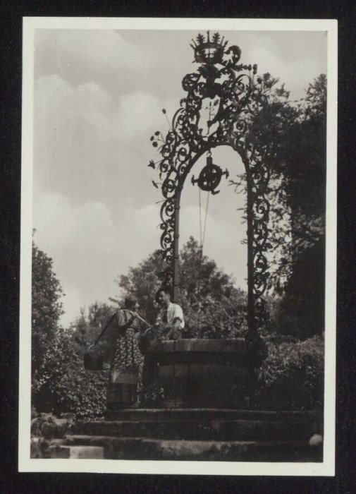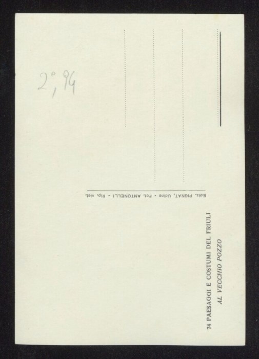 Lo scatto di Umberto Antonelli, farmacista e fotografo attivo in Carnia tra 1909 e 1949, è parte della serie di cartoline pubblicate dal fotografo editore Carlo Pignat con il titolo "Paesaggi e Costumi del Friuli" nella seconda metà degli anni Trenta del Novecento, raffiguranti tutte una Carnia e un Friuli arcadici. L'immagine ritrae un uomo, il modello Italo Luciano Bearzi, e una donna con i costumi tradizionali friulani mentre conversano vicino al pozzo nel cortile del Castello De Valentinis a Tricesimo.