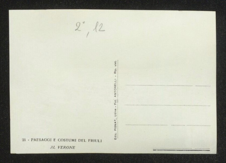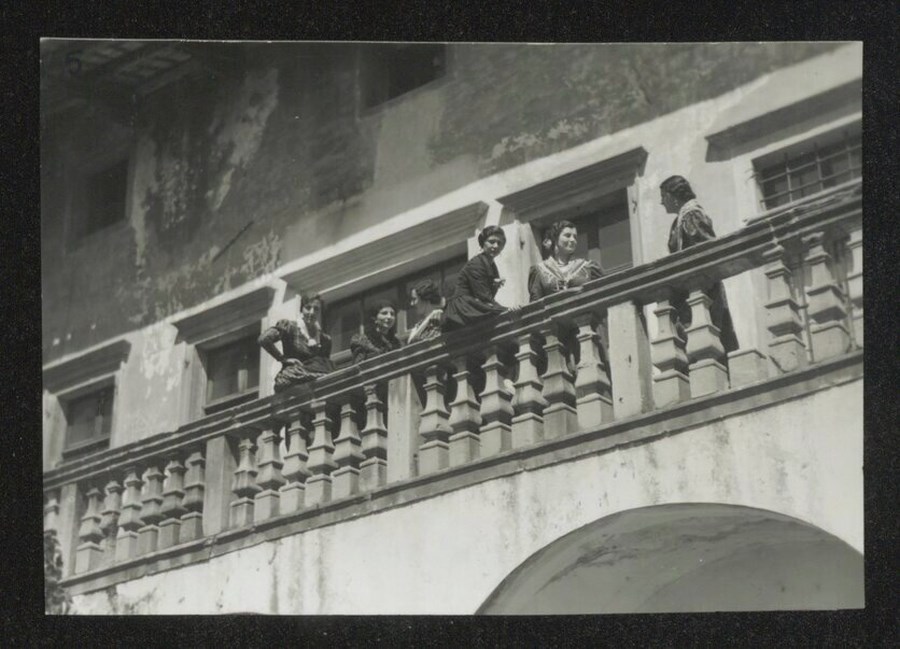 Lo scatto di Umberto Antonelli, farmacista e fotografo attivo in Carnia tra 1909 e 1949, è parte della serie di cartoline pubblicate dal fotografo editore Carlo Pignat con il titolo "Paesaggi e Costumi del Friuli" nella seconda metà degli anni Trenta del Novecento, raffiguranti tutte una Carnia e un Friuli arcadici. Nell'immagine è ritratto un gruppo di giovani donne in abiti tradizionali friulani affacciate ad un ampio balcone con balaustra.