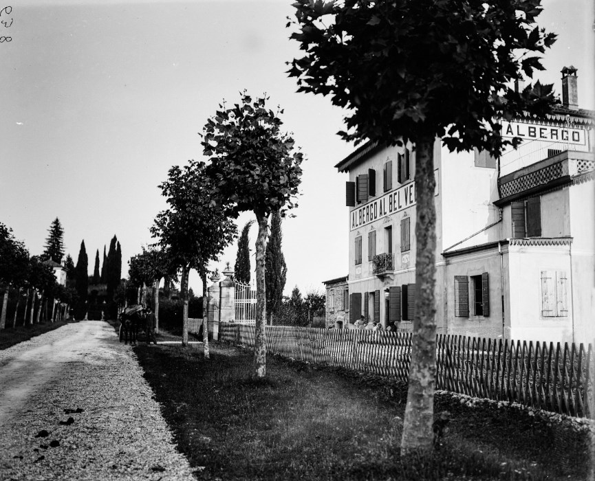 Veduta dell'albergo Belvedere, di alcune persone nel giardino dell'edificio e, fuori dalla staccionata un calesse con un cavallo ed un uomo.