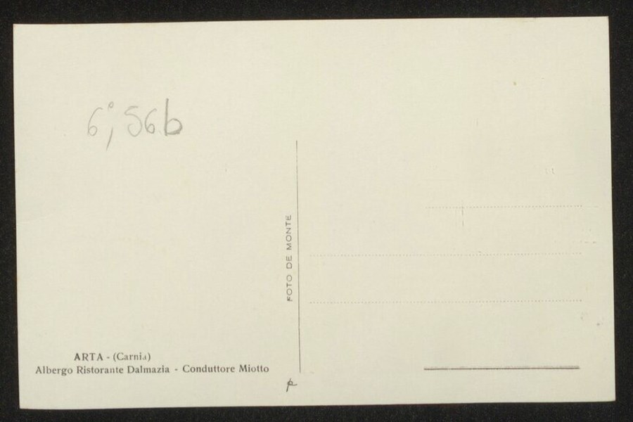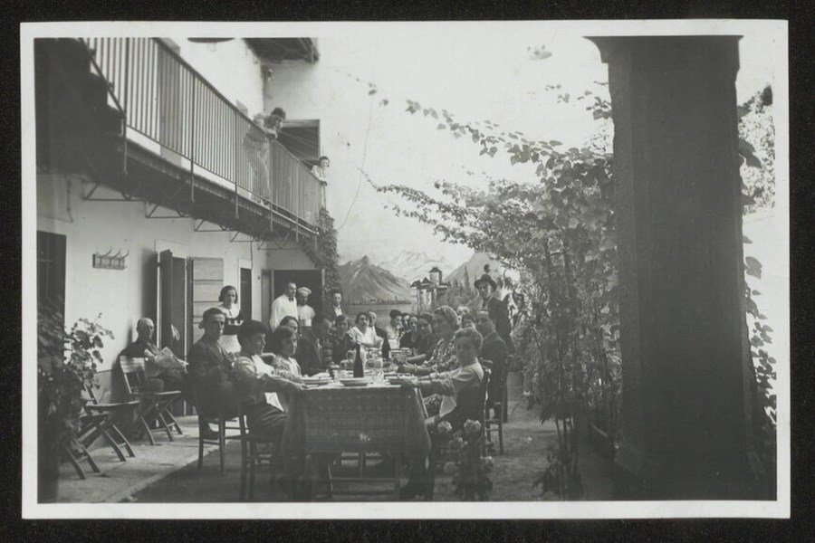 Giardino interno dell'albergo Dalmazia in Arta Terme, con trompe l'oeil sullo sfondo; gruppo di persone (ospiti?) seduto a tavola posa per la foto.