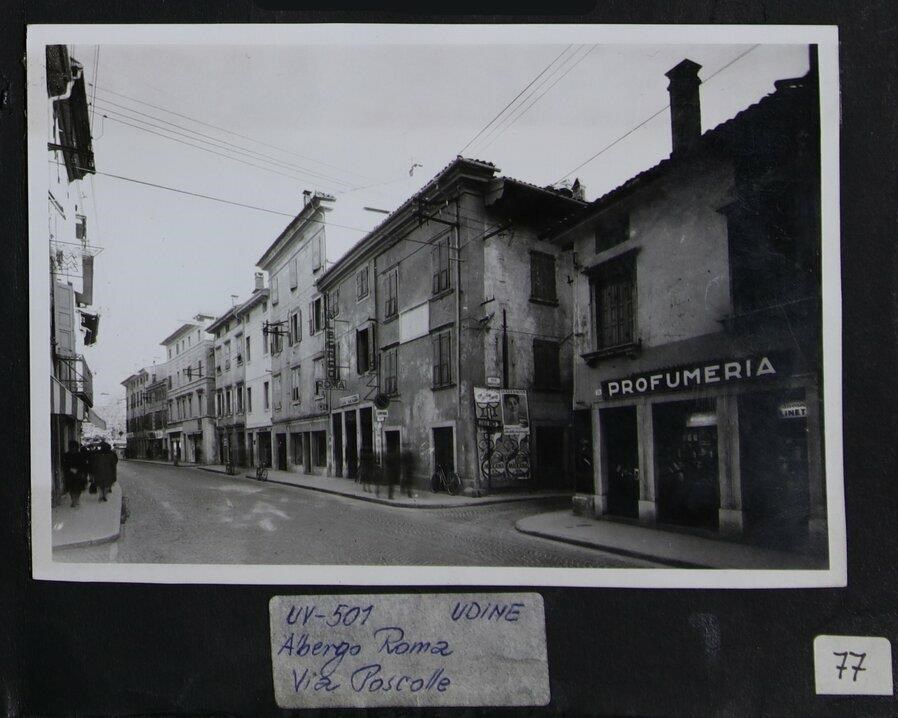 Udine, via Poscolle: l'albergo Roma, di cui è presente, leggermente a sinistra, l'insegna. A destra, in primo piano, una profumeria. Più indietro, dallo stesso lato, alcuni manifesti pubblicitari su un edificio.