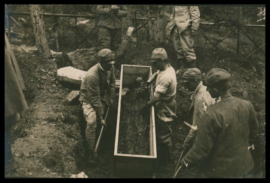 Alcuni soldati compongono i resti della salma di un caduto della Prima Guerra mondiale