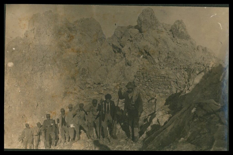 Gruppo di sei militari ed un ufficiale, al seguito di due guide alpine. Secondo la didascalia sul verso, il gruppo si dirige verso luoghi di recupero di salme dei caduti della Prima Guerra mondiale.