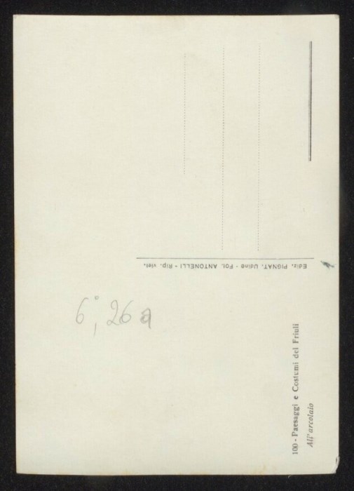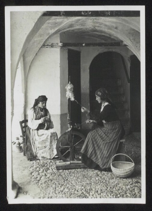 Lo scatto di Umberto Antonelli, farmacista e fotografo attivo in Carnia tra 1909 e 1949, è parte della serie di cartoline pubblicate dal fotografo editore Carlo Pignat con il titolo "Paesaggi e Costumi del Friuli" nella seconda metà degli anni Trenta del Novecento, raffiguranti tutte una Carnia e un Friuli arcadici. L'immagine ritrae due donne con i costumi tradizionali carnici mentre ricamano e filano all'arcolaio nel sottoportico della casa Sovrano a Enemonzo.
