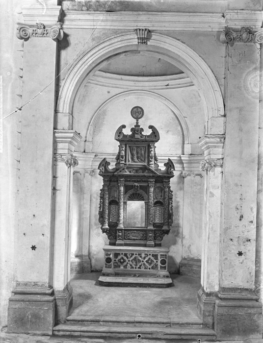 Riproduzione fotografica di un altare privo di sculture all'interno delle nicchie e situato all'interno di una cappella laterale di una chiesa di Venzone.
