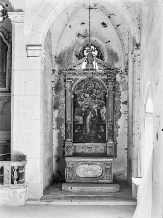 Riproduzione fotografica di un altare ligneo dorato, inserito nell'abside laterale del Duomo di Venzone prima del sisma del 1976; nell'altare c'è una pala dipinta raffigurante dei Santi, la Madonna con Bambino tra angeli.