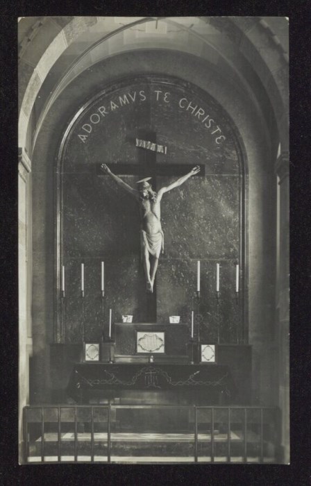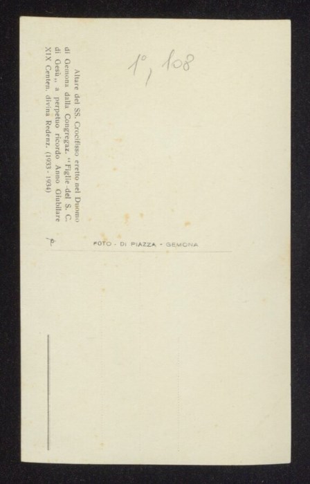 Nella didascalia sul verso dell'immagine si legge: Altare del SS. Crocifisso eretto nel Duomo di Gemona dalla Congregazione "Figlie del Sacro Cuore di Gesù" a perpetuo ricordo dell'anno giubilare XIX Centenario divina Redenzione (1933-0934)
