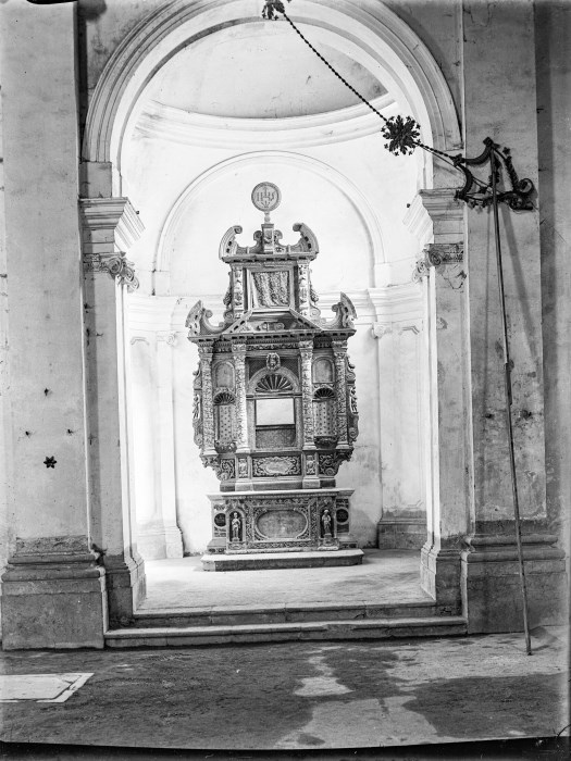 Riproduzione fotografica di un altare ligneo dorato posizionato all'interno di una cappella di una chiesa.