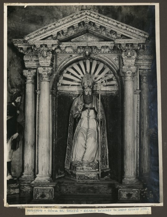 Riproduzione fotografica di un altare laterale in legno dorato al cui interno vi è una nicchia con la statua di un Santo conservato presso la Chiesa della Santissima Trinità a Pordenone.