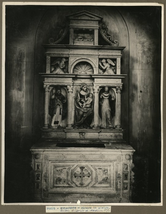 Riproduzione fotografica dell'altare in pietra ad opera di Donato Casella, celebre lapicida lombardo, presso la Chiesa dei Santi Urbano e Sabina a Pozzo di San Giorgio della Richinvelda. Nel basamento c'è lo stemma degli Spilimbergo e il ritratto in bassorilievo del cameraro maggiore; la fascia centrale è tripartita da colonne scanalate, al centro la Vergine con il Bambino e ai lati i SS. Urbano e Sabina. La fascia superiore reca la conchiglia con angeli oranti e l'edicola sovrastante con il Cristo deposto.