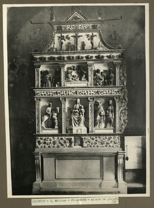riproduzione fotografica dell'altare in pietra, a opera del Pilacorte attorno al 1523, e conservato presso la Chiesa di San Martino a Vito d'Asio. La dimensione architettonica dell'altare è monumentale, a doppio ordine con coronamento raccordato da volute a un timpano. L’opera venne arricchita nel 1563 da un intervento di doratura a bolo e da policromia, secondo il modello in auge nella scultura lignea locale, presto alterata e persa, fino ad assumere nei volti per lungo tempo una coloritura bruno-plumbea. Le figure dell’altare sono disposte su due piani entro nicchie divise da pilastrini: al centro troneggia la Madonna col Bambino, a sinistra si dispone il gruppo con San Martino a cavallo e il povero, e a destra i Santi Giacomo apostolo affiancato da Maria Maddalena. Nella fascia superiore, al centro la natività e a sinistra San Giovanni Battista, le Sante Margherita e Caterina; a sinistra San Michele Arcangelo e San Nicolò. Sulla cimasa la Crocefissione.