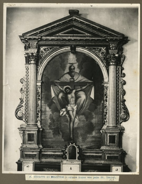 Riproduzione fotografica dell'altare ligneo con la pala della Santissima Trinità conservato presso la Pieve di San Floriano a San Giovanni di Polcenigo. L'altare è composto da due colonne corinzie con un timpano triangolare, in basso, sul basamento un tabernacolo con portella metallica.