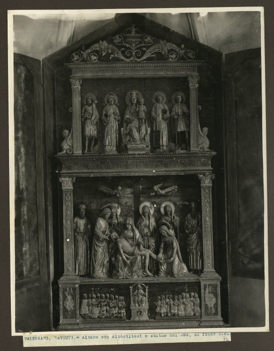 Riproduzione fotografica di un altare in legno ad opera di Gianfrancesco da Tolmezzo, un tempo conservato presso la Chiesa di Santa Maria dei Battuti a Valeriano di Pinzano al Tagliamento, ora a Palazzo Ricchieri a Pordenone. Nel riquadro centrale risplendono le dorature del Compianto sul Cristo deposto, movimentata sacra rappresentazione d'impronta popolare. La predella sviluppa ai lati della Trinità cortei processionali di adepti alla Confraternita e di nobili giovani e donzelle. Nell'alto frontone appaiono allineate, attorno alla Madonna con Bambino, quattro statue di santi.