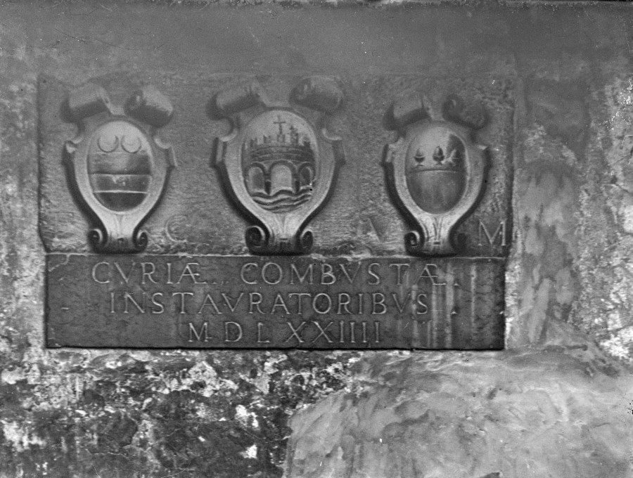 Riproduzione fotografica di tre stemmi in altorilievo e iscrizioni posizionati sulla parete esterna di un edificio; quello centrale con la cinta muraria è lo stemma di Venzone.