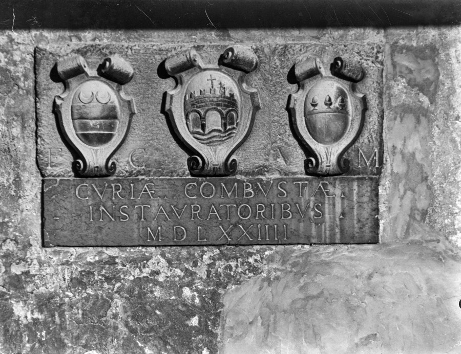 Riproduzione fotografica di tre stemmi in altorilievo e iscrizioni posizionati sulla parete esterna di un edificio; quello centrale con la cinta muraria è lo stemma di Venzone.