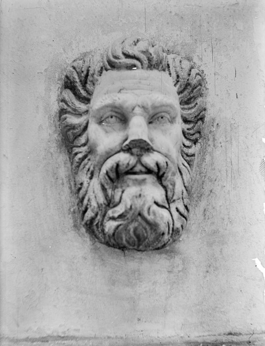 Riproduzione fotografica di un altorilievo del viso di un uomo posizionato su di una parete esterna di un edificio.