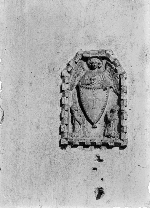 Riproduzione fotografica di un altorilievo raffigurante uno stemma sorretto da un angelo benedicente e due fedeli in orazione; situato sulla parete esterna di una chiesa.