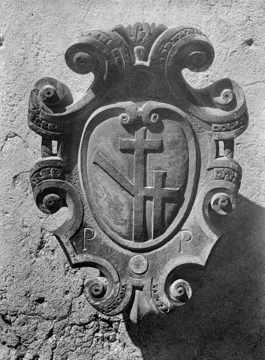 Riproduzione fotografica di un altorilievo con stemma su una parete esterna di un edificio venzonese.