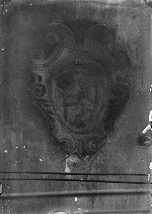 Riproduzione fotografica di un altorilievo in pietra di uno stemma posizionato probabilmente sul muro interno di un edificio.