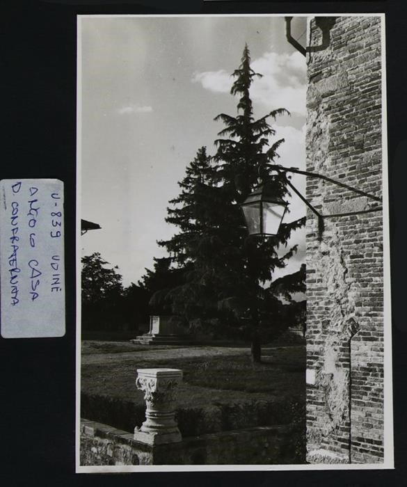 Udine, piazzale del Castello: a destra si intravede la Casa della Confraternita di S. Maria di Castello, edificio con archi in stile gotico sfuggito al terremoto del 1511. Attaccato ad essa, un piccolo lampione. In primo piano a sinistra, un capitello corinzio.