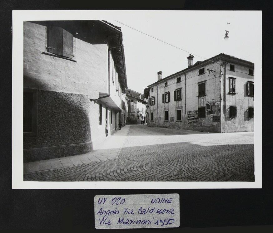 Udine: veduta dell'angolo tra via Jacopo Marinoni e via Generale Antonio Baldissera. Sono presenti tre persone che camminano, di cui due al centro in fondo. Sull'edificio di destra sono affissi diversi manifesti pubblicitari.