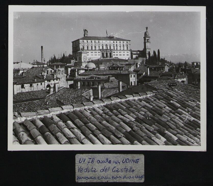 Udine: veduta di uno scorcio della città. In secondo piano, il castello e il campanile della chiesa di Santa Maria di Castello. Più in avanti, la Torre dell'Orologio, che si innesta sulla Loggia di San Giovanni, di Giovanni da Udine (1527). In cima alla Torre, i due Mori e, in mezzo a loro, una campana. Sullo sfondo, a sinistra, la ciminiera del laboratorio di Arturo Malignani, sito in vicolo Sottomonte.