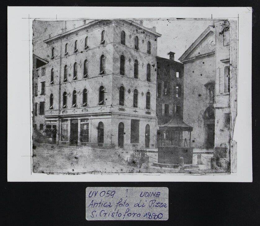 Udine: veduta di piazza San Cristoforo. A destra, la chiesa di San Cristoforo (1358) con il portale principale di Bernardino da Bissone (1518), il quale presenta una lunetta con uno stemma. La facciata è contraddistinta anche da un timpano con modanatura e da un orologio. In basso a destra, un pozzo, che venne tolto alla fine degli anni Ottanta.